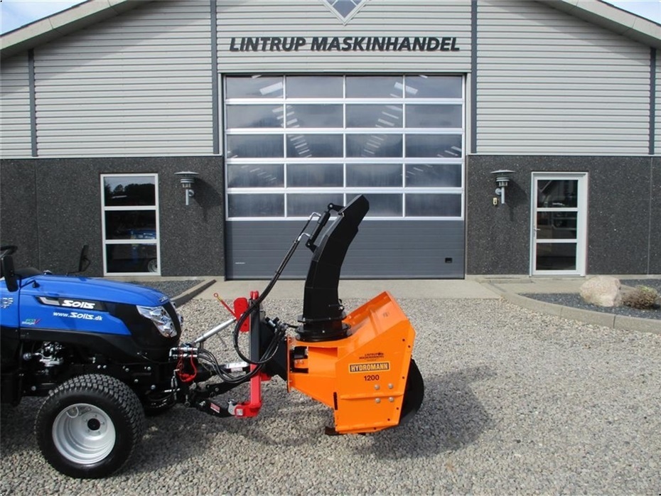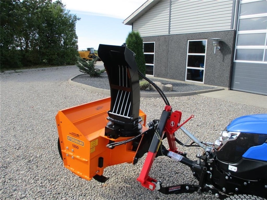 Hydromann 1200SV1000 sneslynge. Den er med hydraulisk vip på udkaster røret og hydraulisk sving på tuden. Der sidder en omskifterventil med en omskifterkontakt så der kun skal bruges 1 dobbeltvirkende fjernudtag. Sneslyngen er ny og ubrugt, men overgemt. Den er med PTO aksel og A-ramme.
