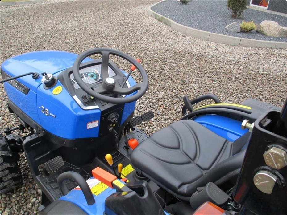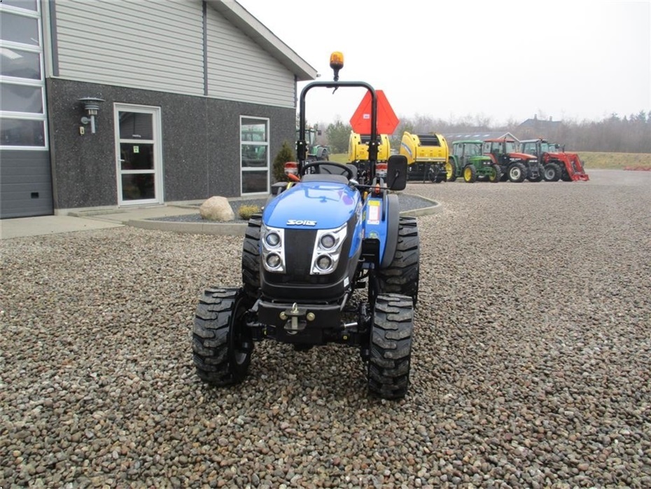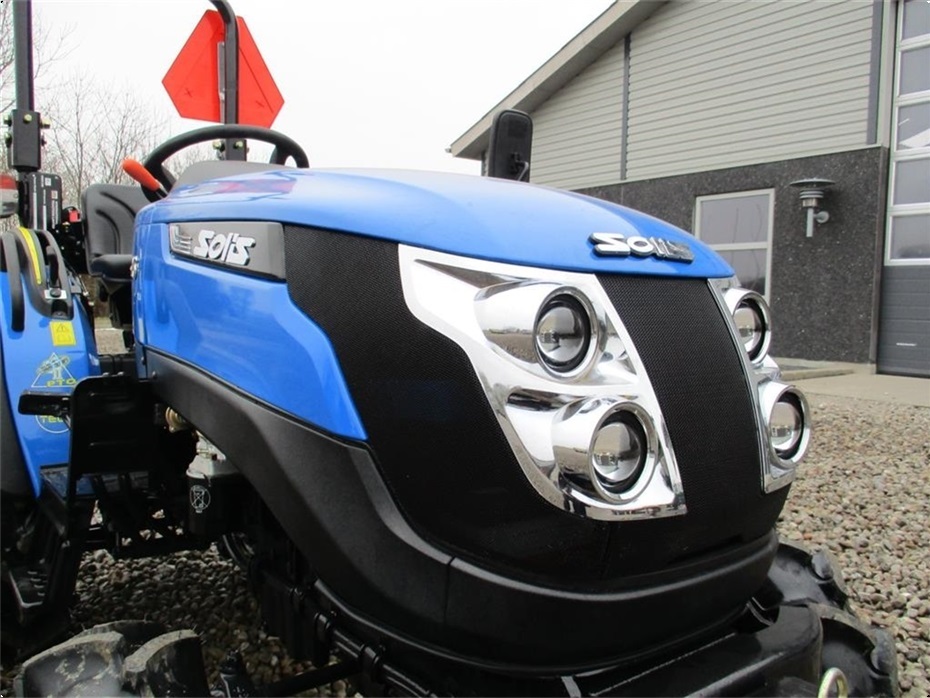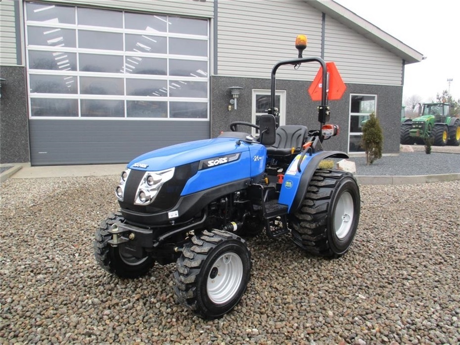 Kvalitets traktor, Solis 26hk med 3cyl Mitsubishi diesel motor. Den har Servo-power styrring og en egenvægt på 1055kg. Den har Kategori-1 lift i bag og kan løfte 600kg, der er justerbare side stabilisatorer på liftarmene. Bag på er der 1 dobbeltvirkende fjernudtag og almindelig gaffeltræk som er svingbart og 540,540E &1000 PTO omd. Dens top hastighed er 17,05kmt og kun 1,53kmt ved 2700rpm i det lavest gear. Diff spærre. Så det er en traktor som er perfekt til brug på planteskoler, hos anlægsgartnere, rideskoler mindre landbrug og andre steder. 12v lys anlæg, arbejdslys og anhængerstik. E-godkendt styrtbøje og traktoren kan selvfølgelig leveres synet og indregistreret med nummerplade hvis det ønskes. Den har Industri hjul på i størrelse 33x15,5-16,5 og 23x8,5-12 på. Den har Mitsubishi motor i og en helt rigtig mini traktor med det hele. Her kan du få en fabriksny kvalitets traktor som er fabrikeret i Indien og lavet af nogen gode kvalitets komponenter. Det er en mekanisk traktor, hvor drift sikkerheden og lave maskine omkostninger er sat i højsædet. Vi kan hjælpe med en meget attraktiv financering af din nye traktor og vi tager meget gerne dine gamle traktor i bytte. Køb-Salg-Bytte ring 74855292 Den kan også lejes for en periode hvis det ønskes.