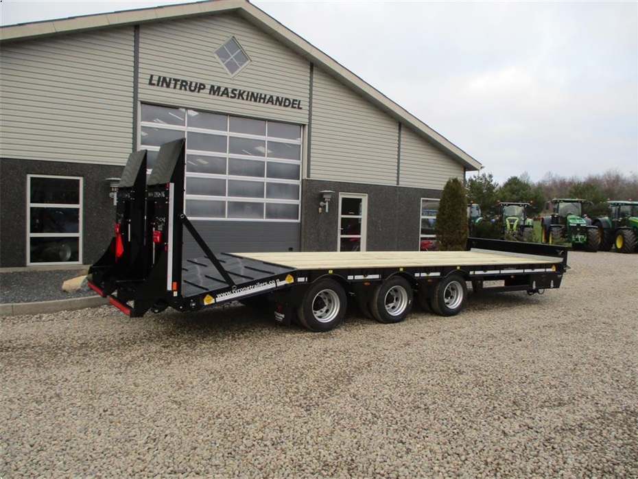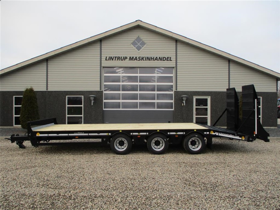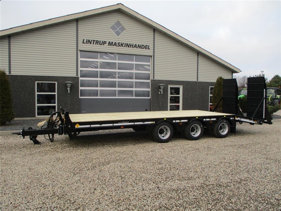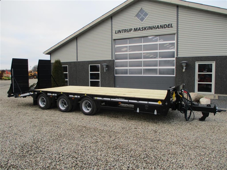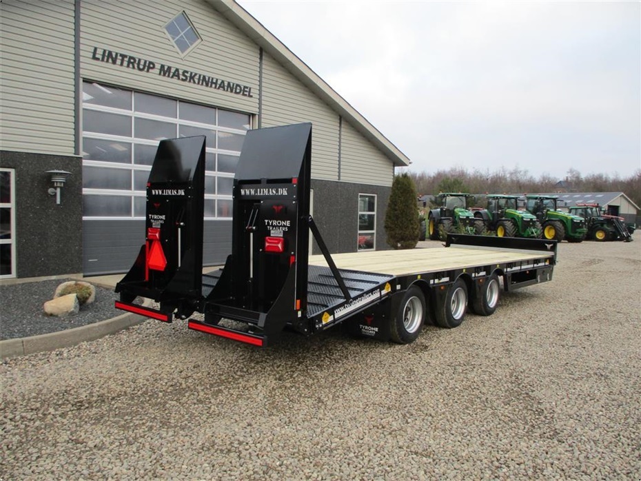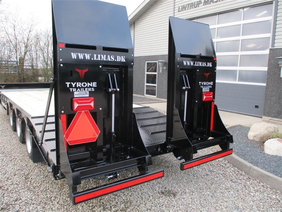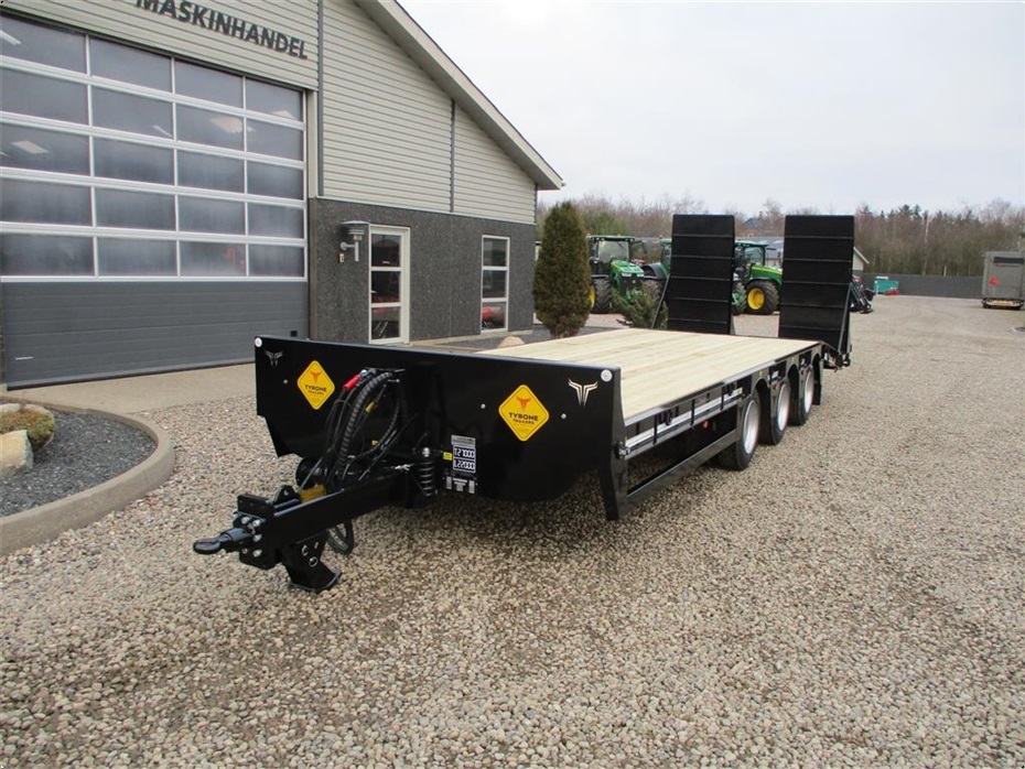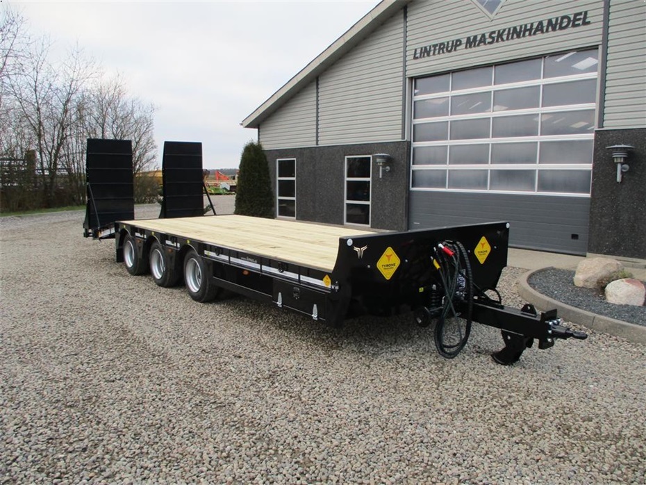 Fabriksny Tyrone 27 ton Maskintransportvogn. Den har en totalvægt på 27000 kg. en egenvægt på 5000kg og en lasteevne på godt 22ton. Vognen er udstyret med affjedret aksler hvor der sidder 215/75R17,5 dobbelthjul på og der er bremser på alle aksler. Størrelsen på den er 2,54m bred, det flade stykke er 6,4m lang, det skrå stykke er 1,55m og de hydrauliske ramper er 90cm brede med en afstand imellem på 73cm. Læssehøjden er ca 90cm og forsmækken er 30cm. Affjedret træk og drejbar porsøjetræk, som også kan flyttes op og ned i højden. En rigtig fin vogn med hydraulisk støtteben, skab i højre side og LED-lys pakke. I bag er der lovpligtig underkørings kofanger på og reflekser både bagpå og hen ad siderne. Vognen er udført med en flot finish. Den er sandblæst, malet godt og har fået epoxy grunder og 2gange Ral lak ovenpå. Vi tager meget gerne dine brugte traktorer i bytte og vi kan også hjælpe med markedets bedste finasiering hvis det ønskes. Se altid over 100 brugte traktorer til salg på vores webside limas.dk