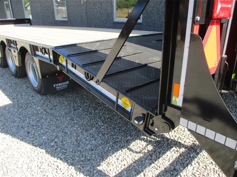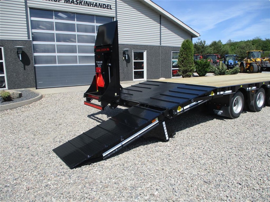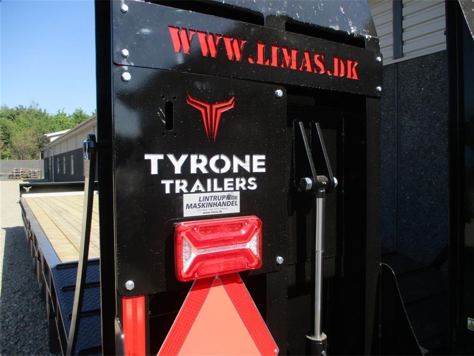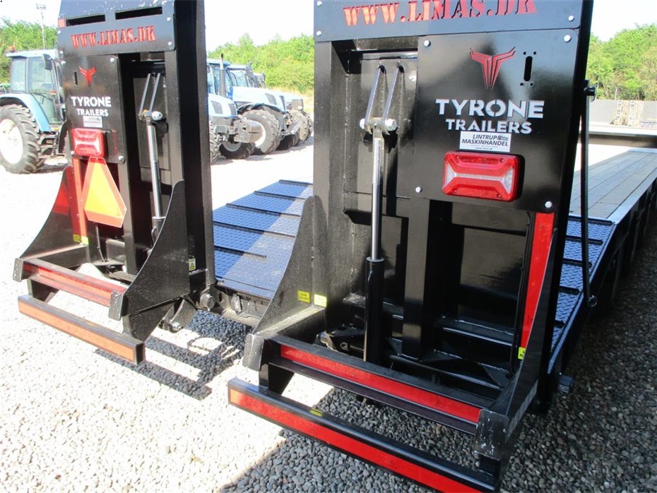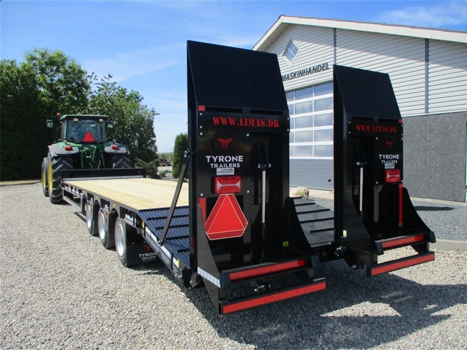 Fabriksny Tyrone 27 ton Maskintransportvogn. Lang model, hvor der er plads til skovle, dieselolie tank og en masse andet. Den har en totalvægt på 27000 kg. en egenvægt på 5000kg og en lasteevne på godt 22ton. Vognen er udstyret med affjedret aksler hvor der sidder 215/75R17,5 dobbelthjul på og der er bremser på alle aksler. Størrelsen på den er 2,54m bred, det flade stykke er 7,93m lang, det skrå stykke er 1,55m og de hydrauliske ramper er 90cm brede med en afstand imellem på 73cm. Læssehøjden er 90cm og forsmækken er 30cm. Affjedret træk og drejbar porsøjetræk, som også kan flyttes op og ned i højden. Der er 4 store lastøjer i hver side samt en masse steder til at sætte stropper på. En rigtig fin vogn med hydraulisk støtteben, skab i højre side og LED-lys pakke. I bag er der lovpligtig underkørrings kofanger på og reflekser både bagpå og hen ad siderne. Vognen er udført med en flot finish. Den er sandblæst, malet godt og har fået epoxy grunder og 2gange Ral lak ovenpå. Vi tager meget gerne dine brugte traktorer i bytte og vi kan også hjælpe med markedets bedste finasiering hvis det ønskes. Se altid over 100 brugte traktorer til salg på vores webside limas.dk