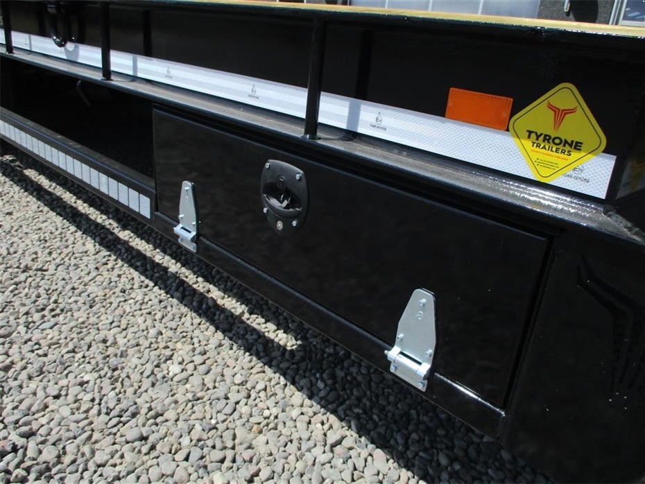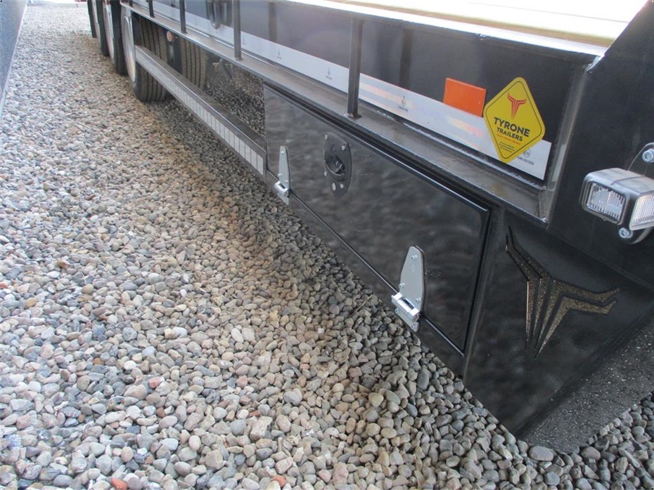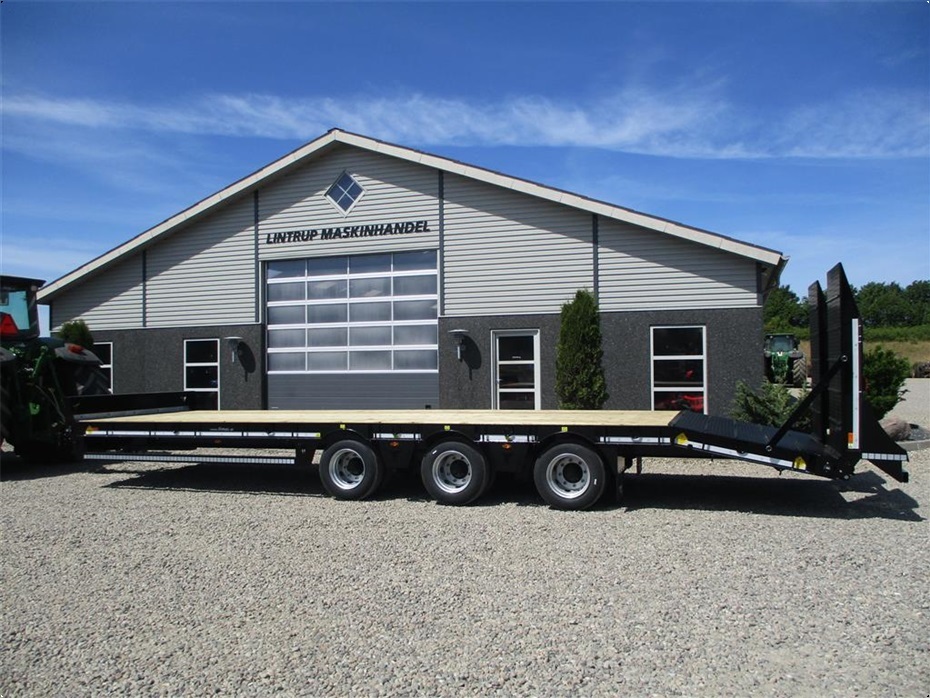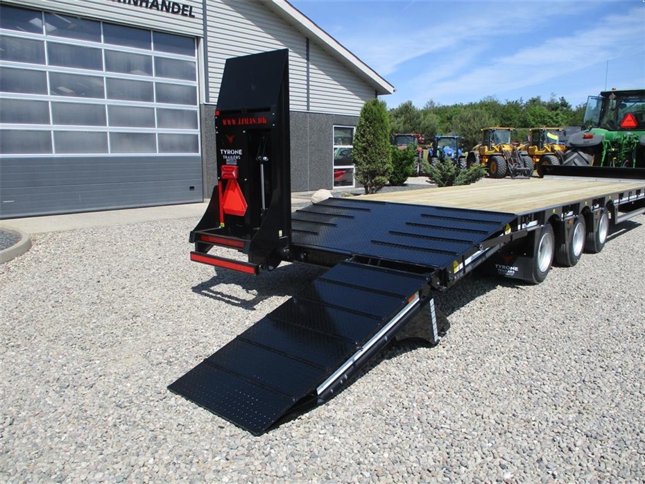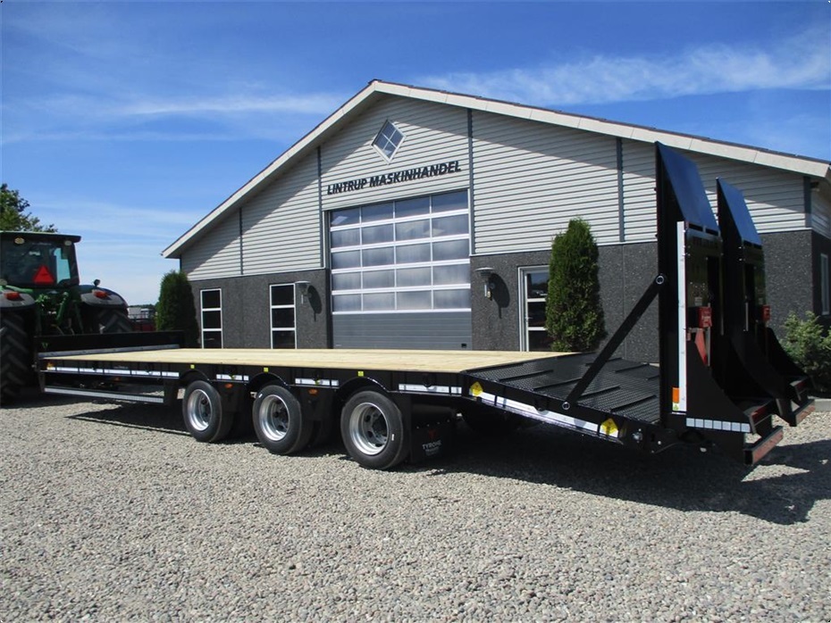 Fabriksny Tyrone 27 ton Maskintransportvogn. Lang model, hvor der er plads til skovle, dieselolie tank og en masse andet. Den har en totalvægt på 27000 kg. en egenvægt på 5000kg og en lasteevne på godt 22ton. Vognen er udstyret med affjedret aksler hvor der sidder 215/75R17,5 dobbelthjul på og der er bremser på alle aksler. Størrelsen på den er 2,54m bred, det flade stykke er 7,93m lang, det skrå stykke er 1,55m og de hydrauliske ramper er 90cm brede med en afstand imellem på 73cm. Læssehøjden er 90cm og forsmækken er 30cm. Affjedret træk og drejbar porsøjetræk, som også kan flyttes op og ned i højden. Der er 4 store lastøjer i hver side samt en masse steder til at sætte stropper på. En rigtig fin vogn med hydraulisk støtteben, skab i højre side og LED-lys pakke. I bag er der lovpligtig underkørrings kofanger på og reflekser både bagpå og hen ad siderne. Vognen er udført med en flot finish. Den er sandblæst, malet godt og har fået epoxy grunder og 2gange Ral lak ovenpå. Vi tager meget gerne dine brugte traktorer i bytte og vi kan også hjælpe med markedets bedste finasiering hvis det ønskes. Se altid over 100 brugte traktorer til salg på vores webside limas.dk