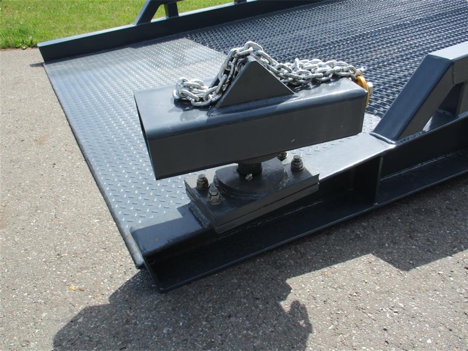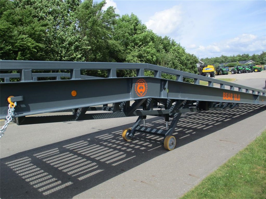 BEAR 10.0 læsse rampe. den har en load capacity på 10.000kg. Længden er på 11.62 m. Opkørsels stykket er på 9.000m og det lige stykke er på 2.3m. Front læben er 2250mm bred og 360mm dyb. Den er 2.45m bred og arbejdes området er 2.25m bred. Den er med sikkerheds railings så man ikke køre ned af den med sin truck. Arbejdshøjen er mellem 800m og 1490mm og højden justeres på rampen hydraulisk med håndpumpe. Den har gaffel lomme så man kan flytte den med sin gaffeltruck. På siderne er der sikkerheds kæder, så den ikke køre væk fra containeren eller lastbilen, når man bruger den. Den er i farven antracit-grå Ral 7016. Den kan også lejes for en periode, også med forkøbsret, ring 74855292 og forhør nærmere om dette.