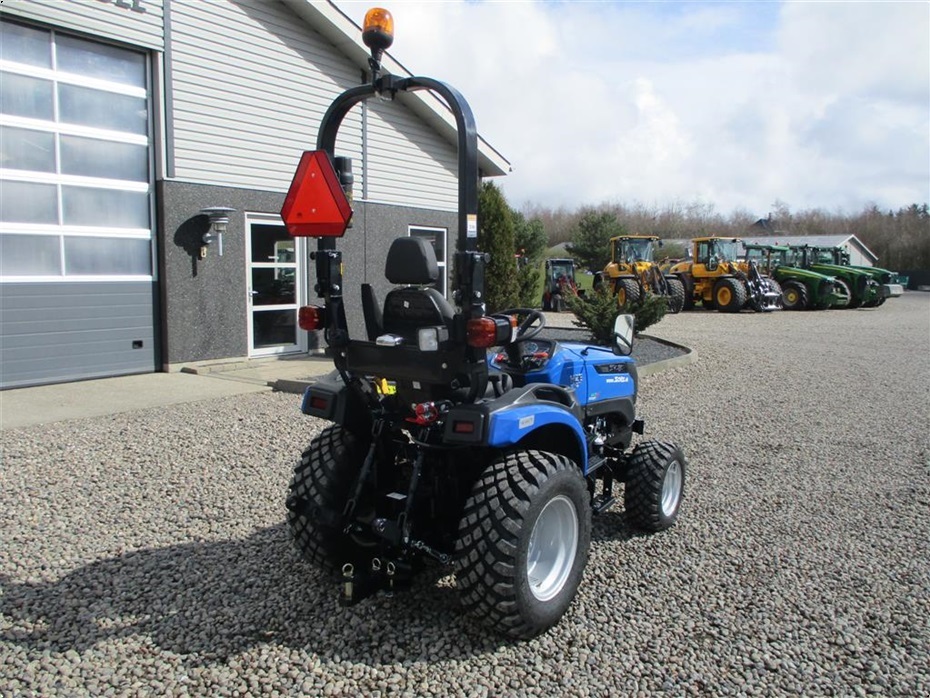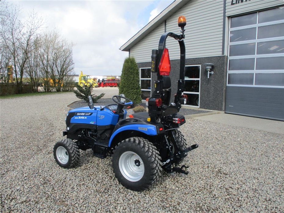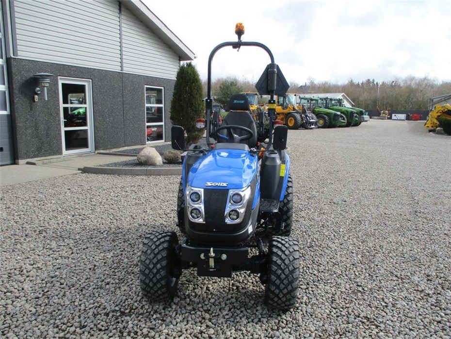 Kvalitets minitraktor fra Solis med 26 hk og 3 cylindre Mitsubishi dieselmotor. Den har en 4wd foraksel med servostyring og en egenvægt på 1055kg. I bag er der en CAT I-N lift med justerbare sidestabilisatorer på liftarmene samt løftekapacitet på 600 kg, 1 dobbeltvirkende fjernudtag, svingbart gaffeltræk og 540 omdr. PTO. Der er også PTO midt på traktoren der kører 2100 omdr. Bagakslen er med differentialespær og oliebadet bremser som kræver minimal vedligeholdelse. Gearkassen er en Hydrostat gearkasse med cruise control. Dens tophastighed er fra 17,4 km/t til 20 km/t ved 2700 omdr. alt efter hvilken dækmontering der vælges. El-anlægget er 12 volts anlæg med kørelys, arbejdslys og 7-polet anhængerstik. Denne traktor er monteret med galaxy garden pro dæk, men kan monteres med Standard dæk, monteringen er 6,50/80-12 i for og i bag er der 280/70R18. Der er mulighed for at vælge imellem Turf dæk (græsdæk) i størrelsen 13,6-16 i bag og 25/8,5-14 i for samt industri dæk i bredden 33*15,50-16,5 i bag og 23*8,50-12 i for, til en merpris. Traktoren har E-godkendt styrtbøjle og kan selvfølgelig leveres indregistreret med nummerplade hvis det ønskes. Her kan du få en fabriksny kvalitets minitraktor som er fabrikeret i Indien og lavet af nogen gode kvalitets komponenter. Det er en mekanisk traktor, hvor drift sikkerheden og lave maskinomkostninger er sat i højsædet. Så det er en traktor som er perfekt til brug på planteskoler, hos anlægsgartnere, rideskoler mindre landbrug og andre steder. Den kan monteres med en original frontlæsser på i traktorens farve, med parallelføring, solis-hurtigskifte, 3die funktion og joy-stikstyring af læsseren.