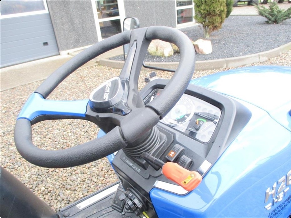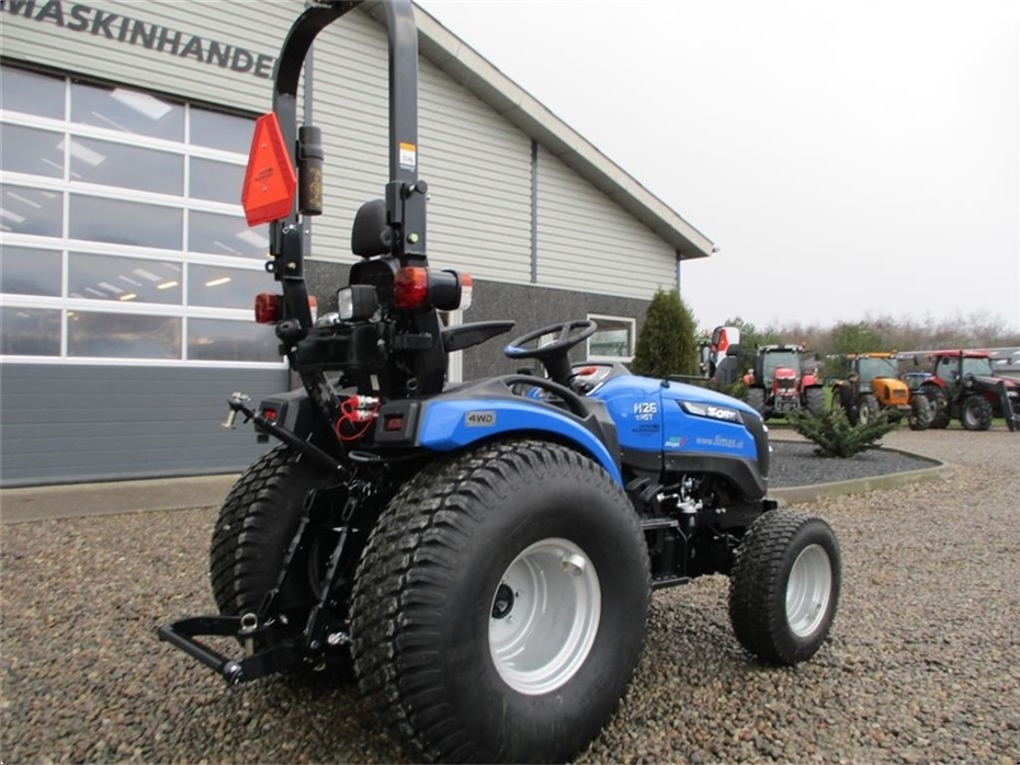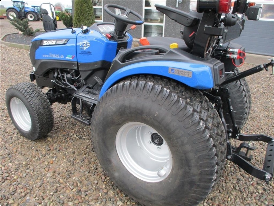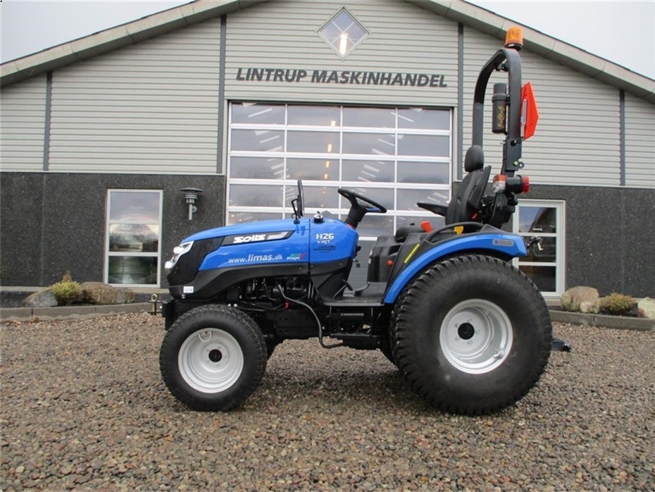 Kvalitets minitraktor fra Solis med 26 hk og 3 cylindre Mitsubishi dieselmotor. Den har en 4wd foraksel med servostyring og en egenvægt på 1055kg. I bag er der en CAT I-N lift med justerbare sidestabilisatorer på liftarmene samt løftekapacitet på 600 kg, 1 dobbeltvirkende fjernudtag, svingbart gaffeltræk og 540 omd. PTO. Der er også PTO midt på traktoren der kører 2100 omd. Bagakslen er med differentialespær og oliebadet bremser som kræver minimal vedligeholdelse. Gearkassen er en Hydrostat gearkasse med cruise control. Dens tophastighed er fra 17,4 km/t til 20 km/t ved 2700 omd. alt efter hvilken dækmontering der vælges. El-anlægget er 12 volts anlæg med kørelys, arbejdslys og 7-polet anhængerstik. Standard dæk monteringen er 6,50/80-12 i for og i bag er der 280/70R18. Der er mulighed for at vælge imellem Turf dæk (græsdæk) i størrelsen 13,6-16 i bag og 25/8,5-14 i for samt industri dæk i bredden 33*15,50-16,5 i bag og 23*8,50-12 i for, til en merpris. Traktoren har E-godkendt styrtbøjle og kan selvfølgelig leveres indregistreret med nummerplade hvis det ønskes. Her kan du få en fabriksny kvalitets minitraktor som er fabrikeret i Indien og lavet af nogen gode kvalitets komponenter. Det er en mekanisk traktor, hvor drift sikkerheden og lave maskinomkostninger er sat i højsædet. Så det er en traktor som er perfekt til brug på planteskoler, hos anlægsgartnere, rideskoler mindre landbrug og andre steder. Den kan monteres med en original frontlæsser på i traktorens farve, med parallelføring, solis-hurtigskifte, 3die funktion og joy-stikstyring af læsseren.