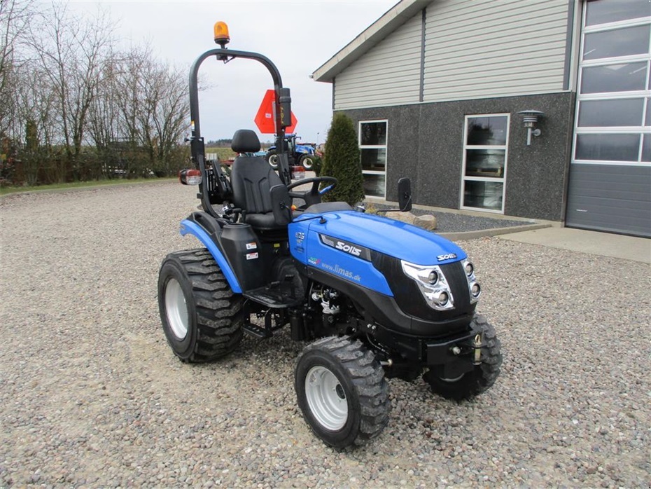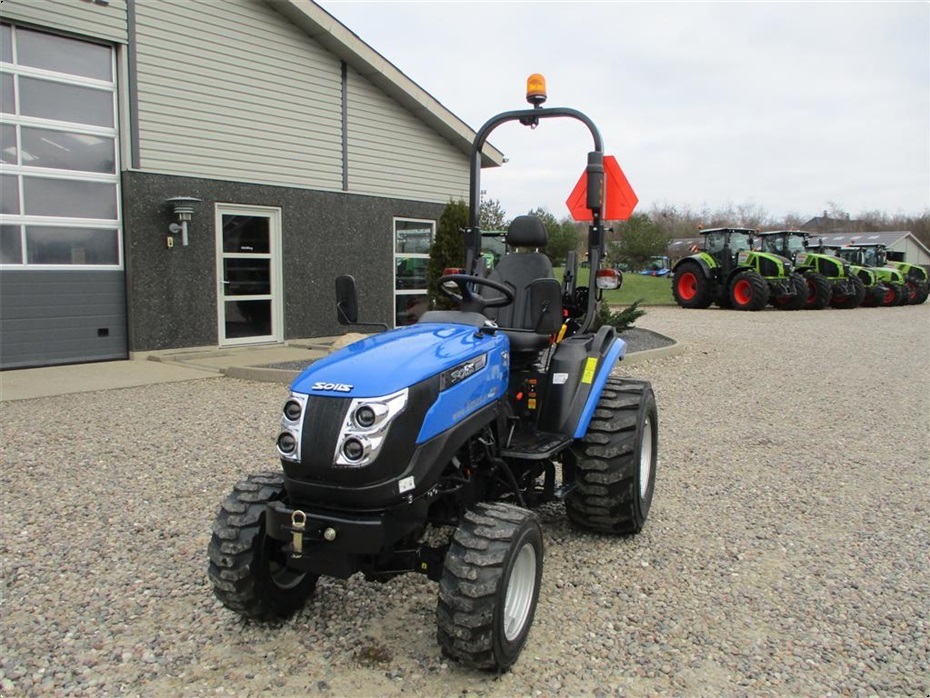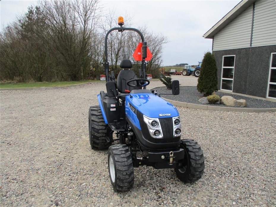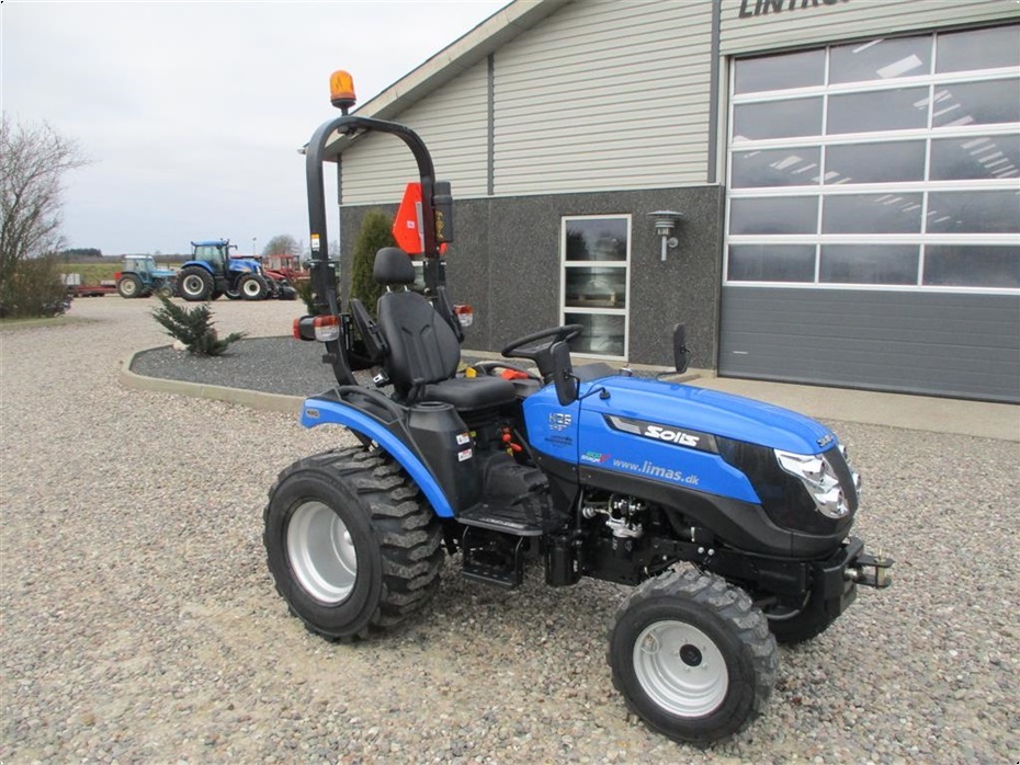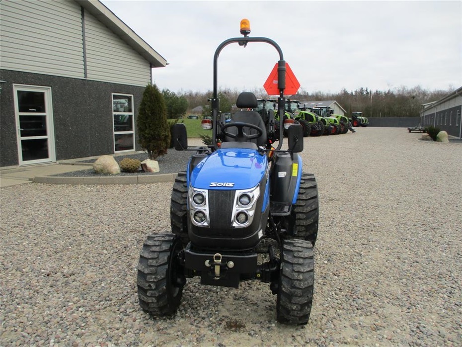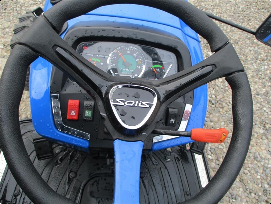 Kvalitets minitraktor fra Solis med 26 hk og 3 cylindre Mitsubishi dieselmotor. Den har en 4wd foraksel med servostyring og en egenvægt på 1055kg. I bag er der en CAT I-N lift med justerbare sidestabilisatorer på liftarmene samt løftekapacitet på 600 kg, 1 dobbeltvirkende fjernudtag, svingbart gaffeltræk og 540 omd. PTO. Der er også PTO midt på traktoren der kører 2100 omd. Bagakslen er med differentialespær og oliebadet bremser som kræver minimal vedligeholdelse. Gearkassen er en Hydrostat gearkasse med cruise control. Dens tophastighed er fra 17,4 km/t til 20 km/t ved 2700 omd. alt efter hvilken dækmontering der vælges. El-anlægget er 12 volts anlæg med kørelys, arbejdslys og 7-polet anhængerstik. Standard dæk monteringen er 6,50/80-12 i for og i bag er der 280/70R18. Der er mulighed for at vælge imellem Turf dæk (græsdæk) i størrelsen 13,6-16 i bag og 25/8,5-14 i for samt industri dæk i bredden 33*15,50-16,5 i bag og 23*8,50-12 i for, til en merpris. Traktoren har E-godkendt styrtbøjle og kan selvfølgelig leveres indregistreret med nummerplade hvis det ønskes. Her kan du få en fabriksny kvalitets minitraktor som er fabrikeret i Indien og lavet af nogen gode kvalitets komponenter. Det er en mekanisk traktor, hvor drift sikkerheden og lave maskinomkostninger er sat i højsædet. Så det er en traktor som er perfekt til brug på planteskoler, hos anlægsgartnere, rideskoler mindre landbrug og andre steder. Den kan monteres med en original frontlæsser på i traktorens farve, med parallelføring, solis-hurtigskifte, 3die funktion og joy-stikstyring af læsseren.